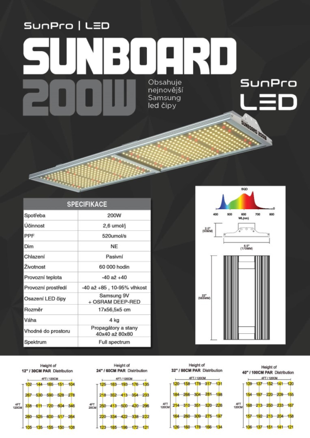SUNBOARD LED 200W - nejnovější LED osvětlení od SUNPRO s vysokým světelným tokem PPF až 520µmol/s a účinnosti svítidla 2,6µmol/J, spolehlivě pokryje pěstební plochu 60x60 až 80x80cm.
